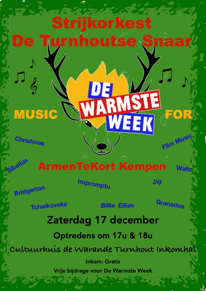 Iets teruggeven tijdens DE WARMSTE WEEK doen we met plezier! Dit jaar spelen we, DE TURNHOUTSE SNAAR o.l.v. violiste Eva Vermeeren, voor Expertisecentrum Dementie, TANDEM in Turnhout. Kom jij je verwarmen aan onze klanken?