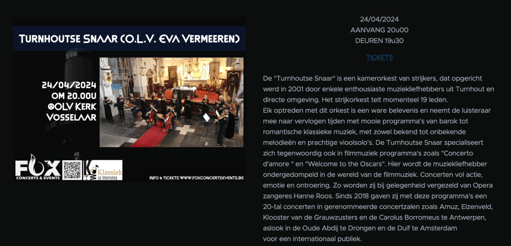 Turnhoutse Snaar: Woensdag 24 april 2024 20u Fox Concerts & Events Plaats : OLV Kerk Vosselaar Tickets: https://www.foxconcertsevents.be/concerten/