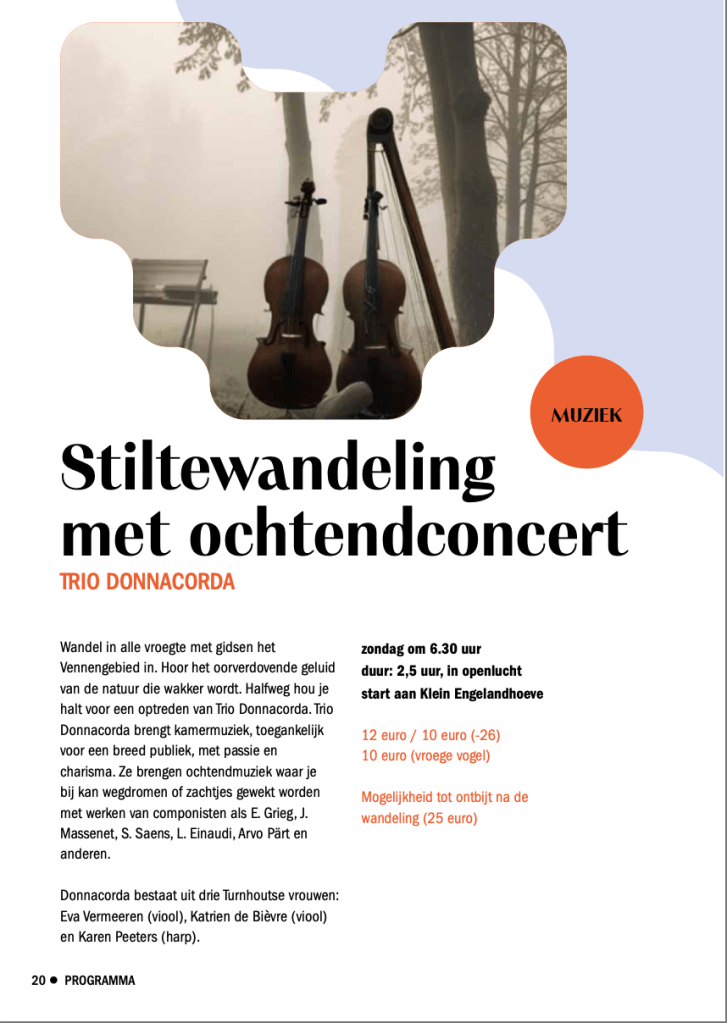 GEANNULEERD Zo 2 juni Ochtendconcert Trio Donnacorda i.s.m. CC Warande Turnhout Festival in Vennen & Velden Stiltewandeling met Ochtendconcert https://www.warande.be/programma/8178/stiltewandeling-met-ochtendconcert/met-trio-donnacorda