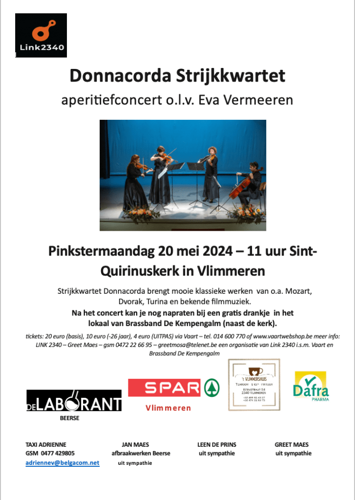 Ma 20 mei 2024 Apéritiefconcert Strijkkwartet Donnacorda 11u Sint-Quirinuskerk Vlimmeren