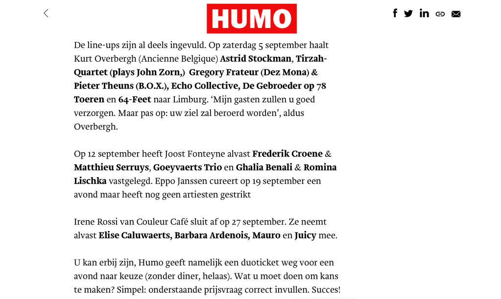 Het Tirzah-Quartet brengt de filmmuziek van de Amerikaans-Joodse componist John Zorn tot leven in een kleurrijke bezetting van viool, harp, cello, en bas/ gitaar. De arrangementen van dit kwartet werden opgemerkt door de componist zelf die het gezelschap de exclusieve toestemming gaf zijn filmmuziek uit te voeren. Bovendien nodigde hij hen uit om te spelen op zijn zestigste verjaardagsfeest tijdens Gent Jazz Festival in 2013. Tirzah-Quartet grasduint door het meest toegankelijke deel van Zorns werk en doet een greep uit zijn ‘Filmworks’. Dat gaat van joodse thema’s over latin en swingende bravourestukjes tot delicaat en ragfijn kantwerk.